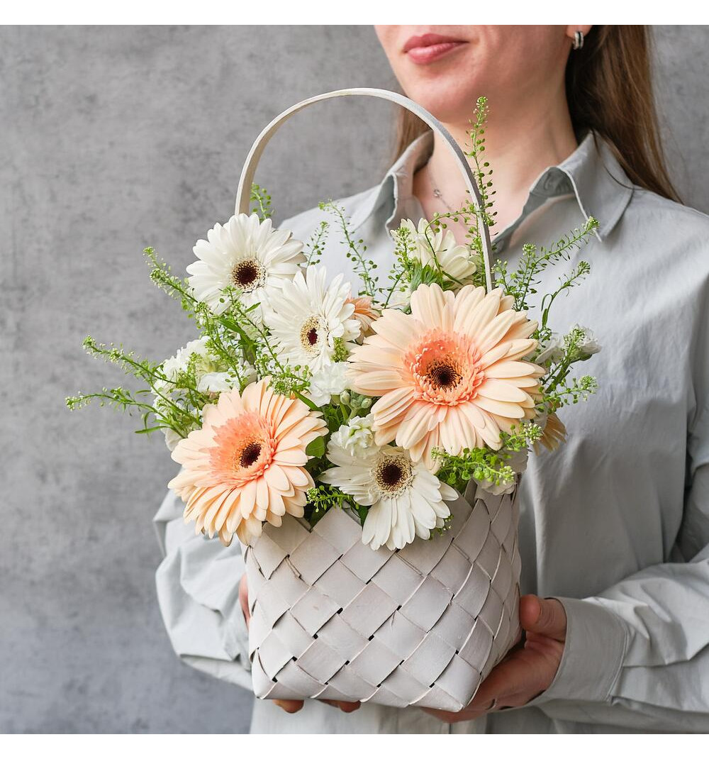 "Нежная корзинка с ромашками и герберами" - это очаровательный цветочный ансамбль, воплощающий легкость и нежность летнего поля. Белоснежные ромашки и яркие герберы создают яркое сочетание, наполняя пространство свежими красками. Корзинка, украшенная изящными цветами, придаст вашему интерьеру уют и шарм, а также станет прекрасным подарком для друзей и близких, символизируя свежесть и заботу. Подарите эту нежную композицию, чтобы подчеркнуть особенность и важность каждого момента в жизни.
